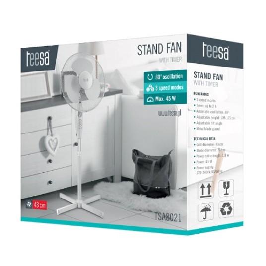 Wentylator został wyposażony w funkcję Timer, co oznacza, że możesz ustawić porę jego automatycznego wyłączenia. Do zalet urządzenia z pewnością zaliczyć można także regulowaną wysokość oraz możliwość zmiany kąta nachylenia. Wentylator Teesa to także bezpieczeństwo, a wszystko dzięki metalowej osłonie, która otacza śmigła urządzenia. Wypróbuj go już dziś i poczuj powiew chłodnego powietrza w upalne dni!