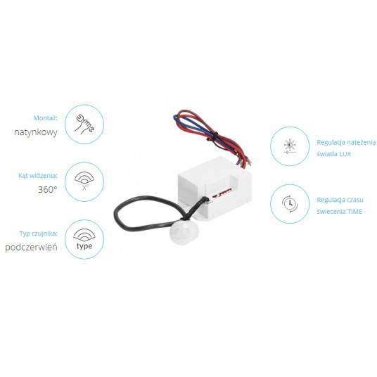 Czujnik ruchu z zewnętrznym sensorem, służy do automatycznego sterowania oświetleniem lub innymi urządzeniami elektrycznymi. Oświetlenie jest włączane za pomocą czujnika ruchu PIR, który działa na podczerwień. Przełączniki typu DIP-switch do regulacji: czasu świecenia i czułości natężenia światła. Czujnik współpracuje z oświetleniem LED-owym.