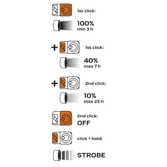 4 funkcje świecenia 100%, 40%, 10%, strobe