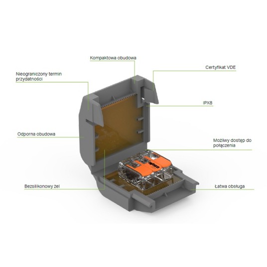 - Certyfikat VDE potwierdzający IPX8 dla całego systemu osłon żelowych i złączek WAGO