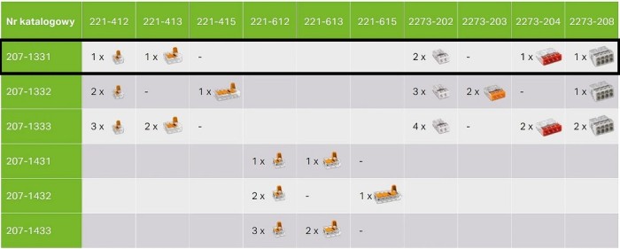 Dopuszczalne kombinacje złaczek instalacyjnych i Gelboxa dla 207-1331
