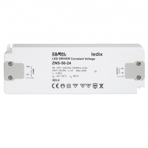 Zasilacz impulsowy ZNS przeznaczony jest do stosowania w domowych instalacjach oświetlenia LED. Modułowa konstrukcja umożliwia łatwy i wygodny montaż do powierzchni poziomych jak i pionowych wewnątrz pomieszczeń. Zasilacz charakteryzuje się napięciem wyjściowym 24 V DC. Oferowane są w szerokim zakresie mocy wyjściowej (12w÷75W). Wbudowane zabezpieczenia gwarantują nieprzerwaną i niezakłóconą pracę wszystkich podłączonych elementów LED.