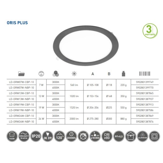 Panel LED czarny okrągły podtynkowy / wpuszczany 7W NW (barwa neutralna) ORIS GTV LD-ORW07W-NBP-10
