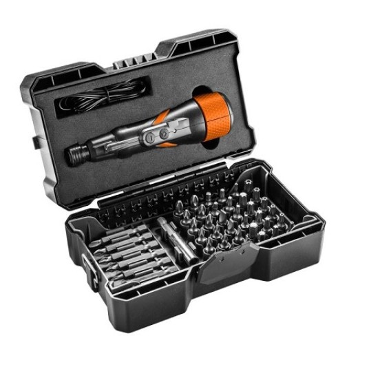 Wielofunkcyjny wkrętak akumulatorowy NEO ze złączem USB-C z kompletem końcówek wkrętakowych przeznaczony jest do wielu prac w zależności od użycia odpowiedniej nasadki.