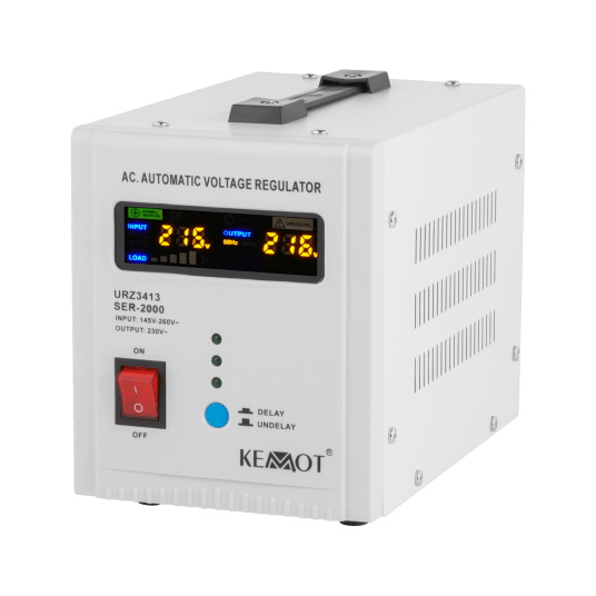 Jeśli potrzebujesz stabilizatora napięcia do urządzeń posiadających duży chwilowy prąd rozruchowy wybierz model wyposażony w funkcję opóźnienia załączenia DELAY. KEMOT SER-2000, został wyposażony w przycisk opóźnienia załączania DELAY w zakresie od 6 do 180 sekund, co obniży ryzyko jego uszkodzenia, gdy podłączone do niego urządzenia mają duży chwilowy prąd rozruchowy. Ponadto stabilizator SER-2000 posiada zabezpieczenia przed zbyt wysokim i niskim napięciem, przeciążeniem, przegrzaniem i zwarciem.