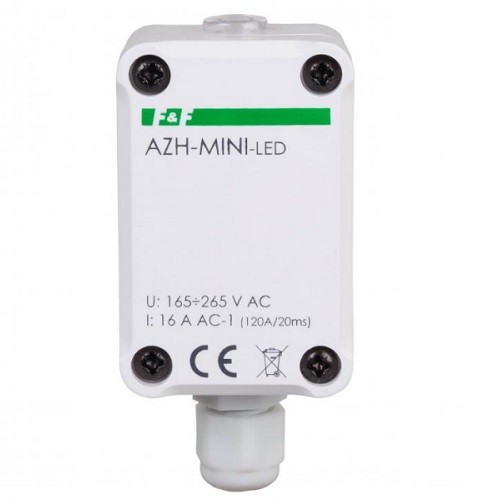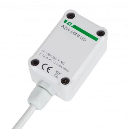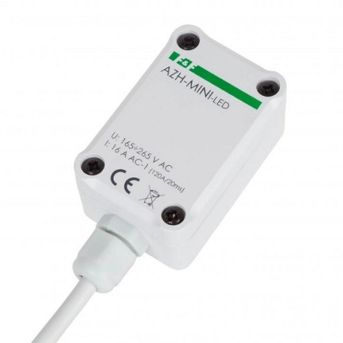 AZH-MINI-LED to automat zmierzchowy z wbudowanym czujnikiem światła, zamknięty w hermetycznej obudowie i specjalnie przystosowany do załączania oświetlenia LED.