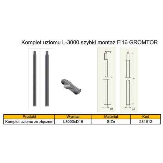 231612 Komplet uziomu 3 metry (2x1500) fi16 GROMTOR 231612