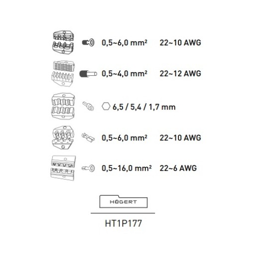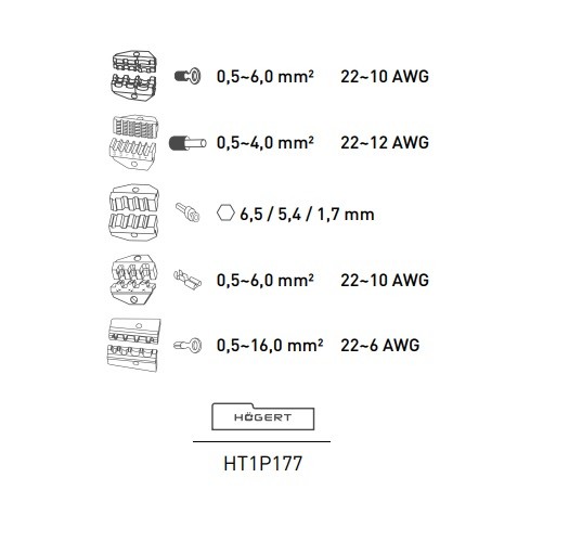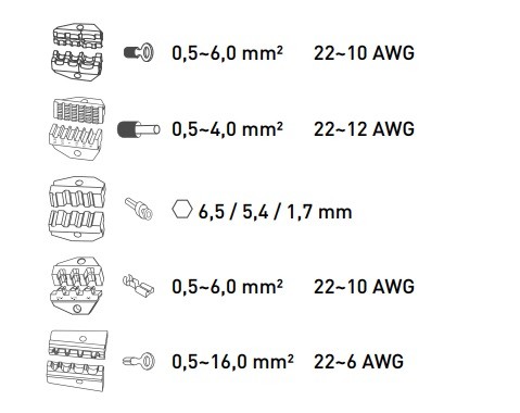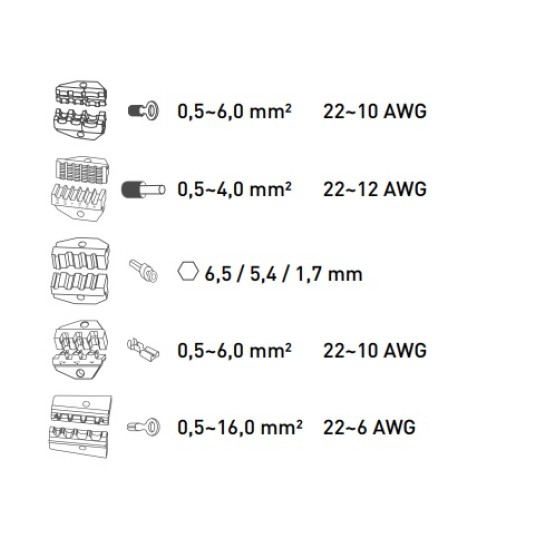 5 różnych matryc pozwalających na zaciskanie złączek o przekroju poprzecznym 0,5 – 6,0mm2 (AWG 22 – 10) oraz 0,5 – 16 mm² (AWG 22 – 6);