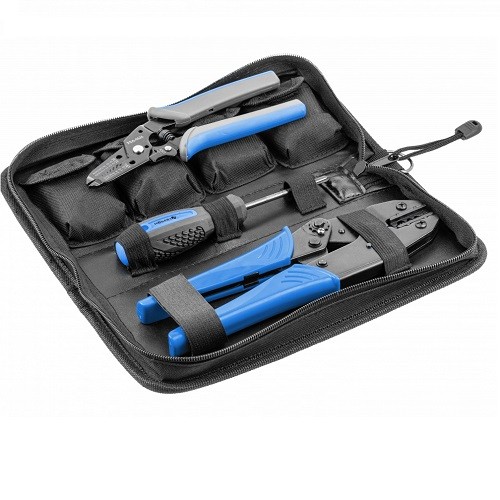Uniwersalny zestaw szczypiec do zaciskania złączek elektrycznych z 5 wymiennymi matrycami, umożliwiającymi pracę z wieloma popularnymi rodzajami złączy elektrycznych. System szybkiej wymiany matryc pozwala na ich sprawną wymianę, w zależności od rodzaju aktualnie zakuwanej złączki. Dodatkowo zawarty w zestawie ściągacz izolacji wraz z obcinakiem zapewniają wszystkie niezbędne narzędzia konieczne do wykonania pracy, zapakowane w jednym wygodnym futerale. Wykorzystywane przy pracach instalacyjnych i montażowych w serwisach elektronicznych, jak również w mechanice samochodowej czy telekomunikacji.